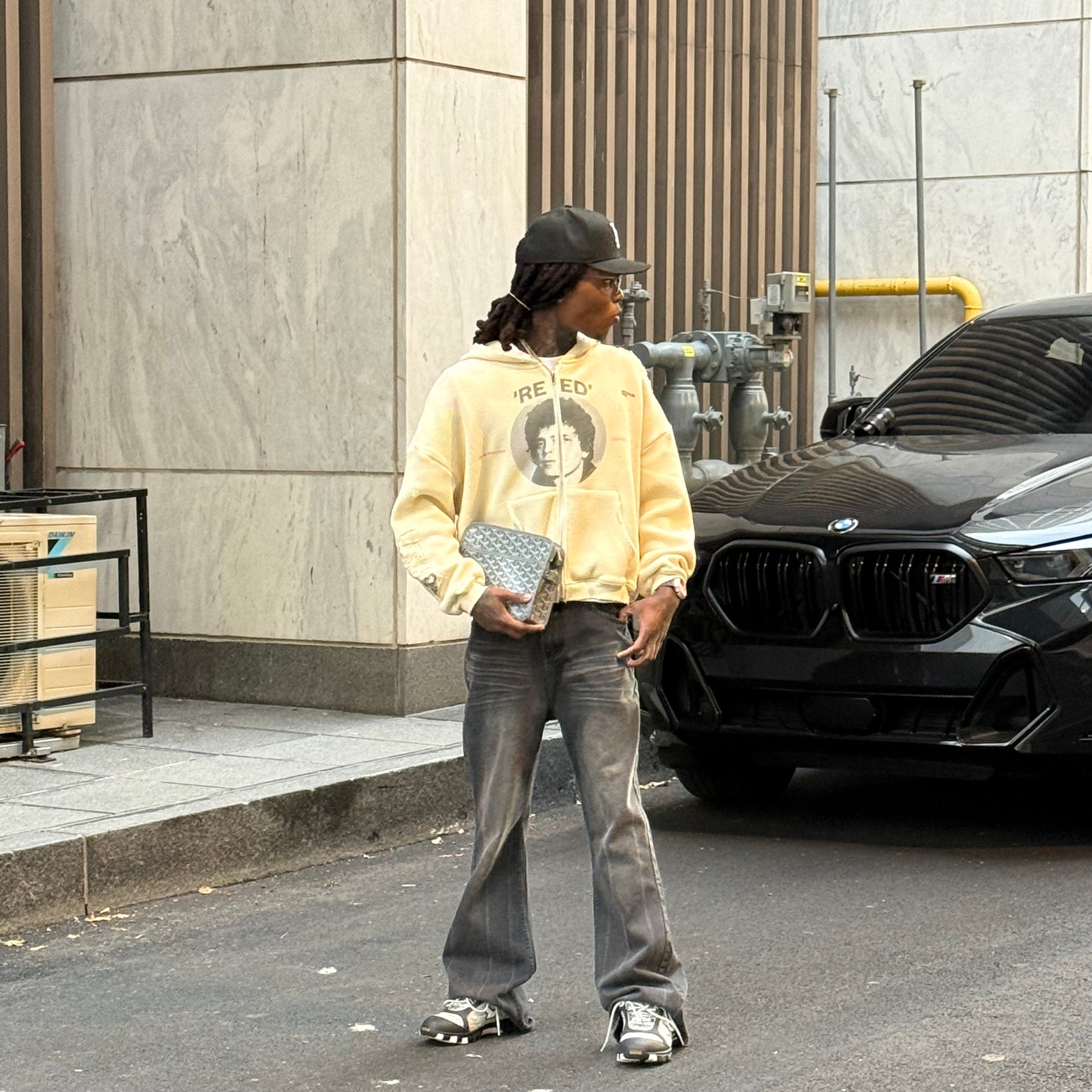 Heavyweight thermal zip-up, screen printed logos. Distressing added all over.