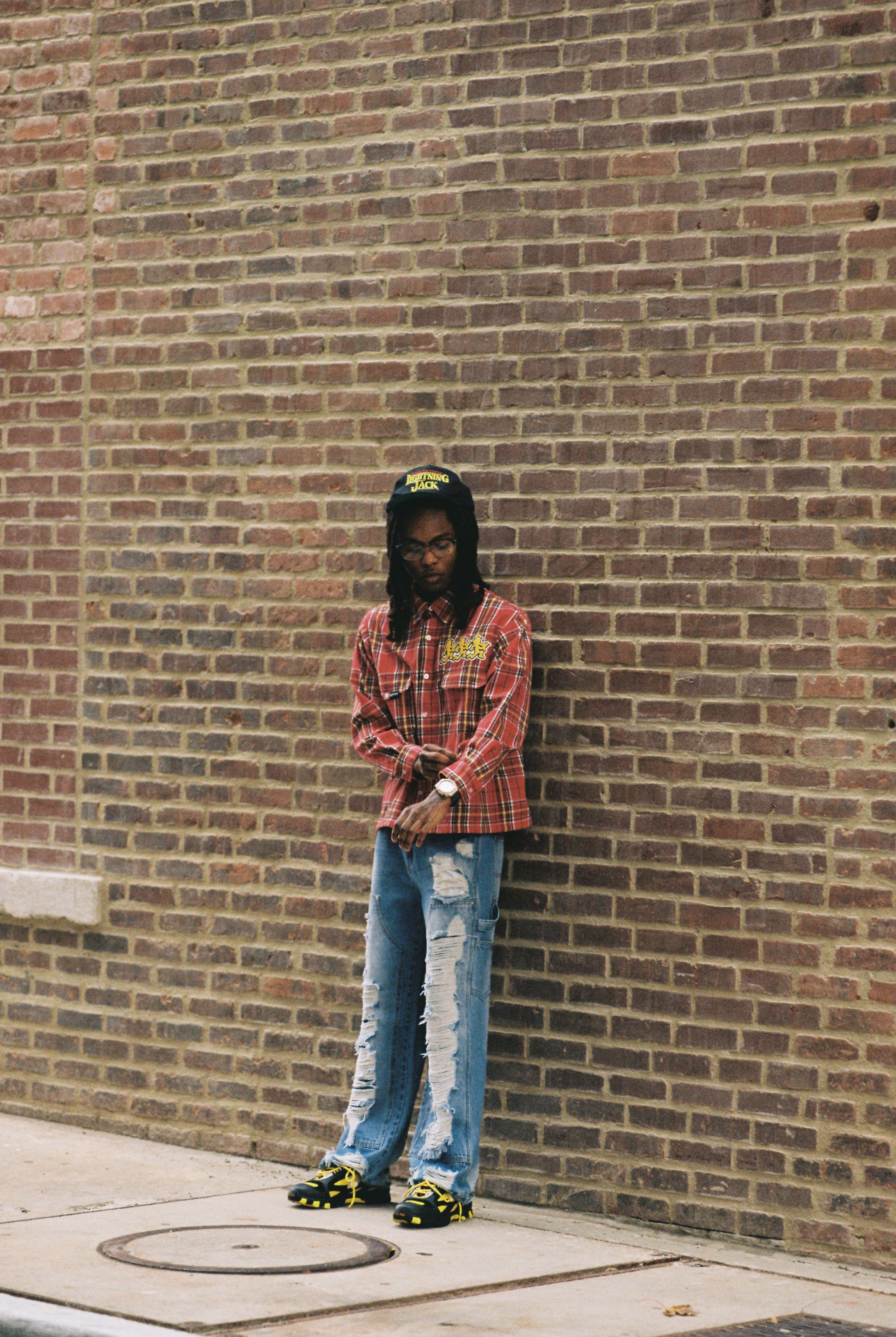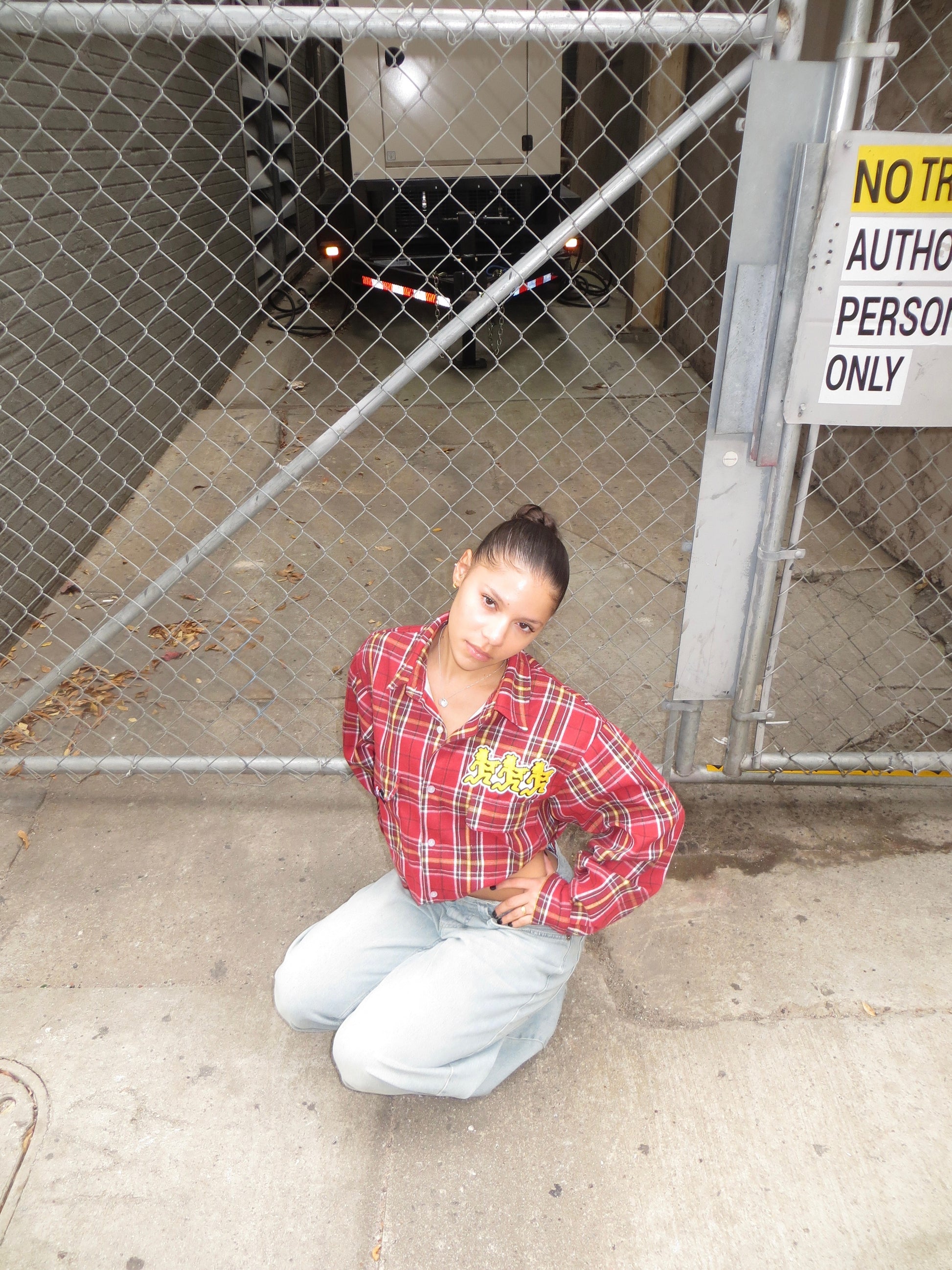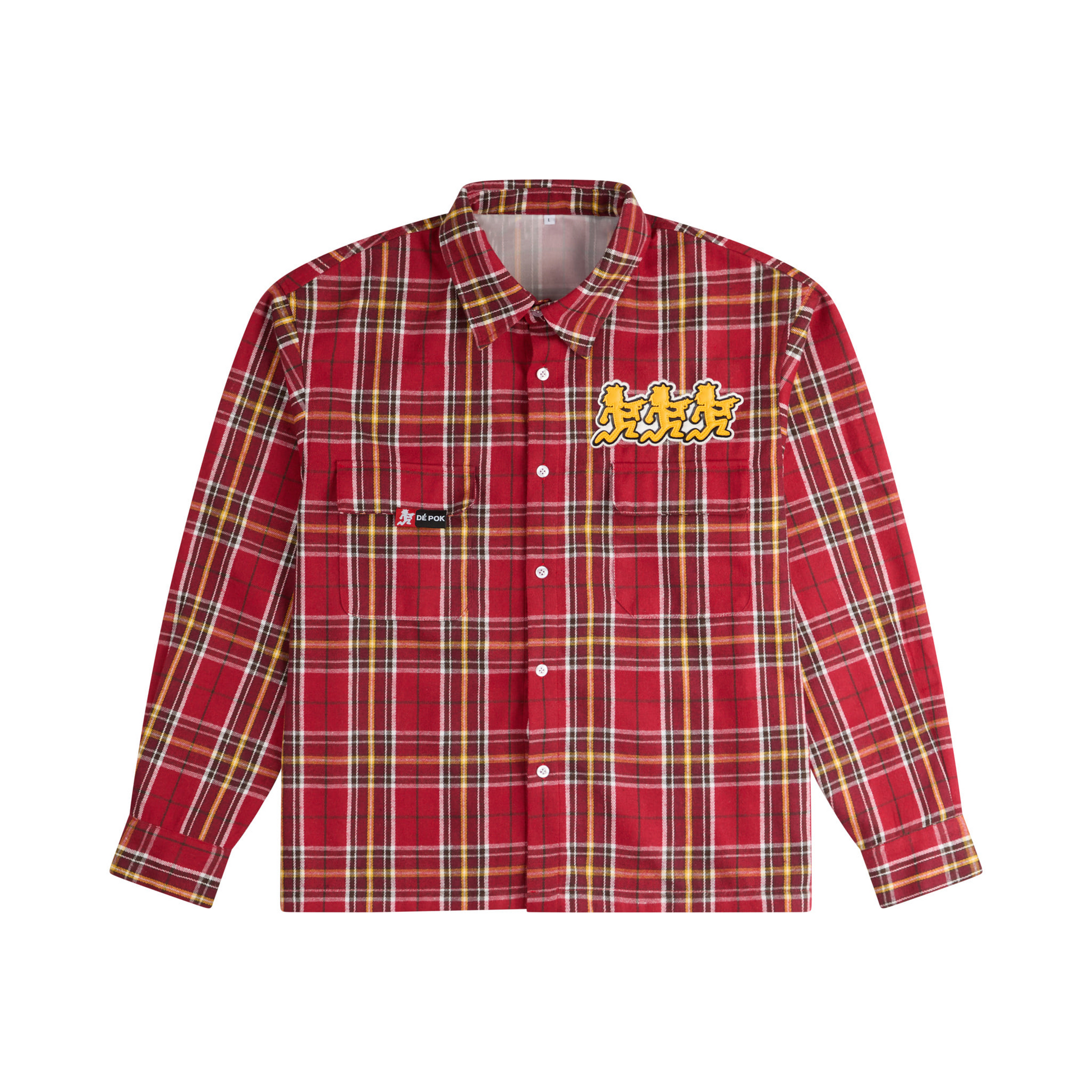 Lightweight flannel, leather logos stitched to chest. Light distressing added all over.